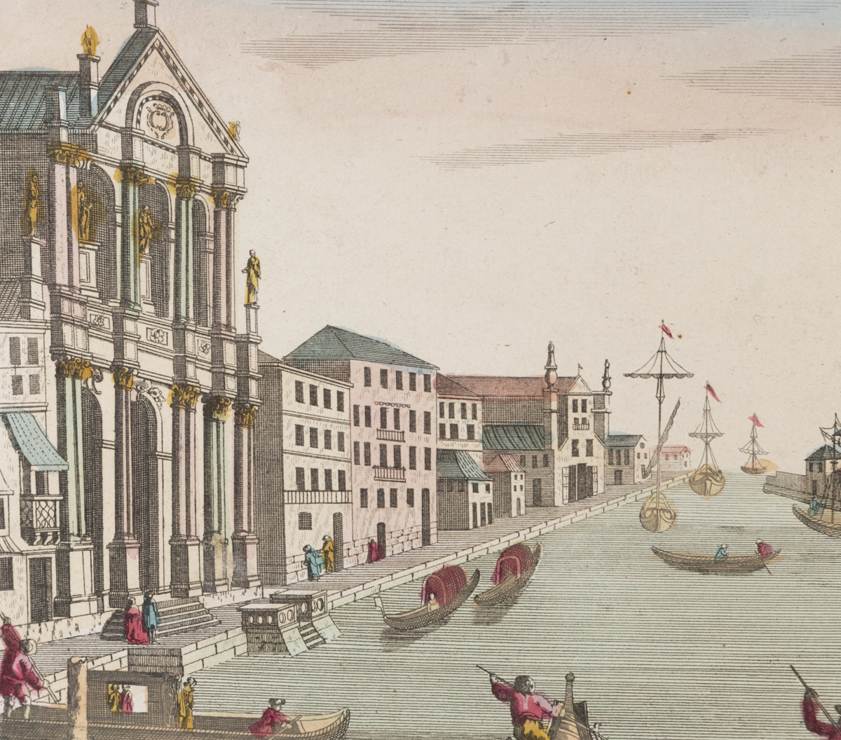 A SET OF TWELVE FRENCH 18TH CENTURY 'VUE D'OPTIQUES' IN WATER GILT AND PAINTED FRAMES