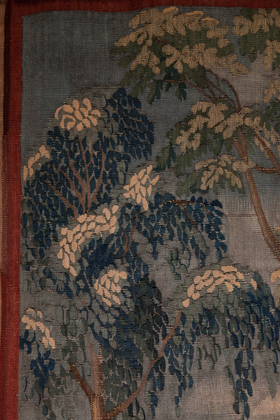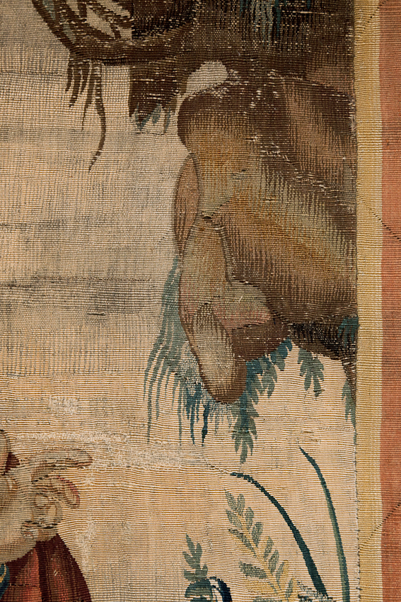 The tapestry depicts Apollo at Vulcan’s forge, the moment when the god Apollo visits Vulcan and tells him that his wife Venus is having an affair with Mars the god of war. Apollo is shown wearing a red toga turning towards Vulcan who is not seen but his anvil and tools are depicted to the bottom right hand side of the tapestry. Venus and Mars are seen to the left in an embrace. Apollo’s chariot is shown in the clouds above his head.