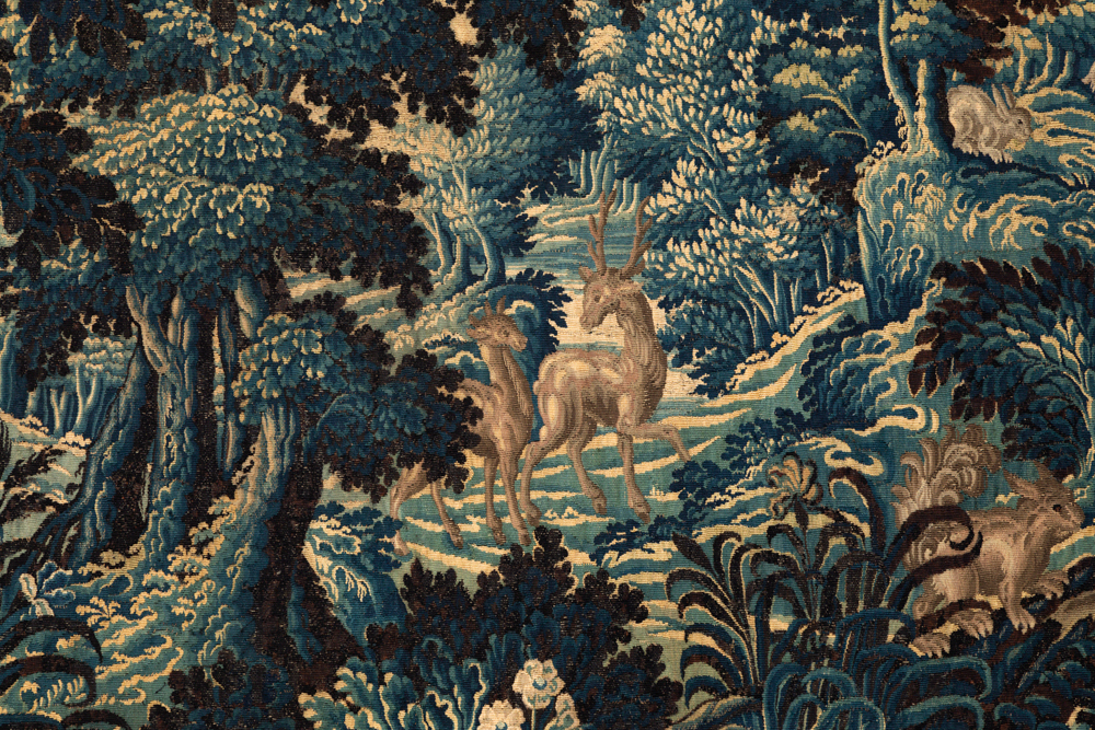 Woven in wool and silk, with a huge wooded view with numerous animals and birds.