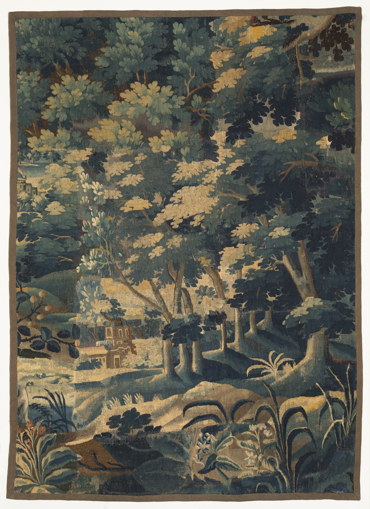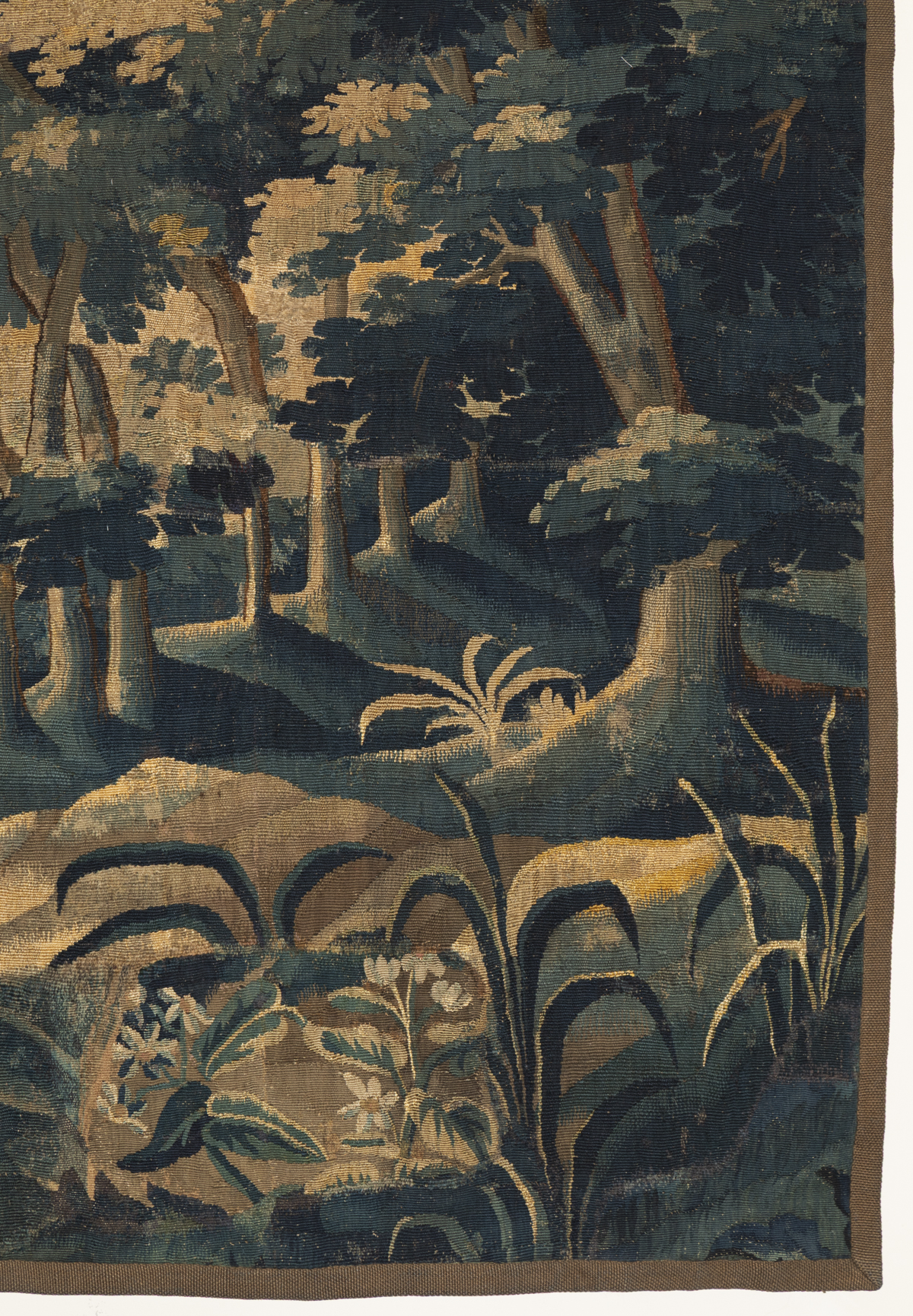 With a line of trees in the centre of the tapestry surrounded by further woodland, plants and flowers in the foreground.