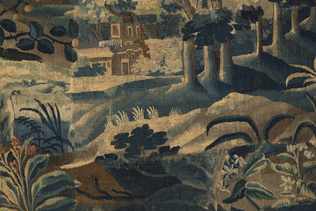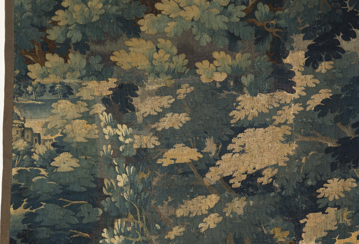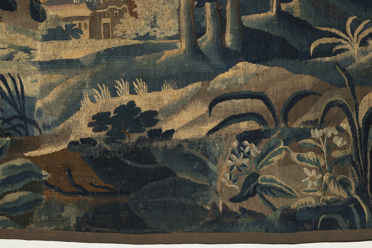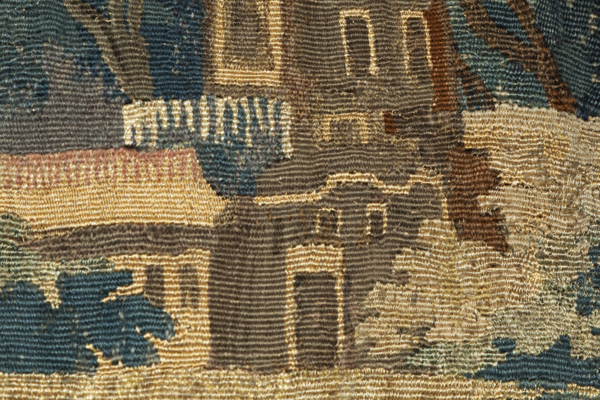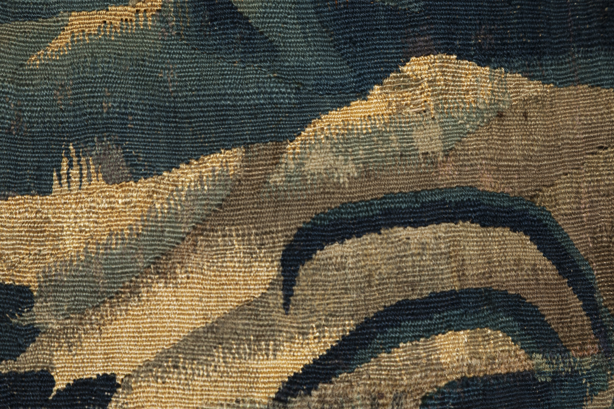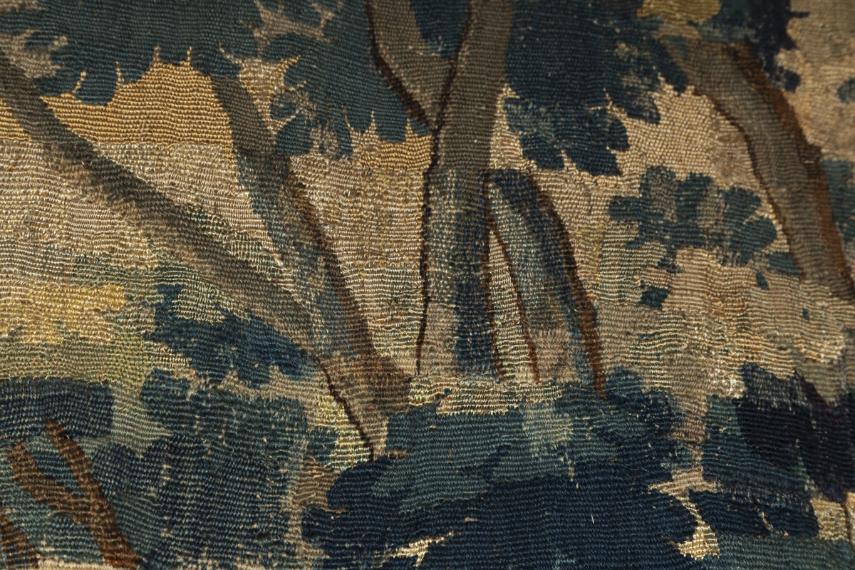 The tapestry is a fragment and has had some patching, visible in the photographs.